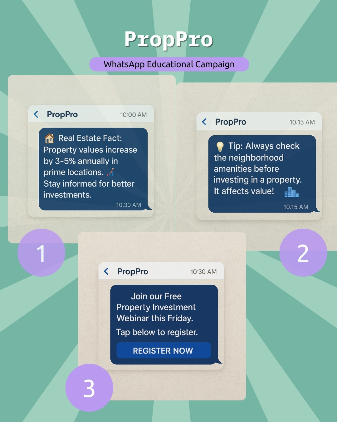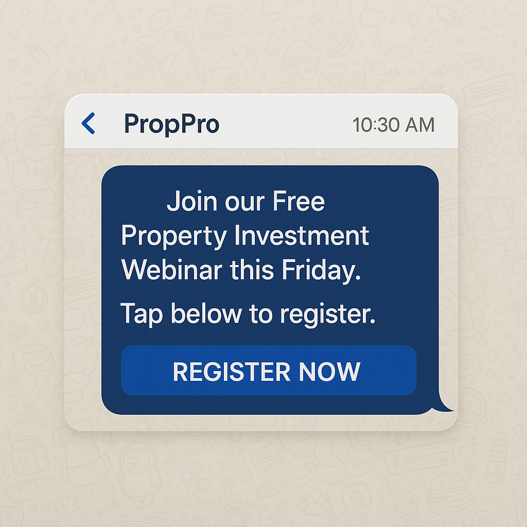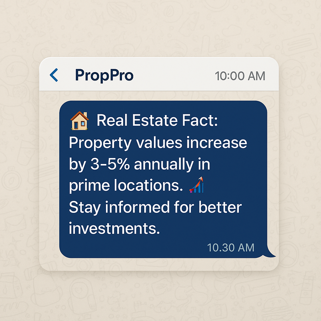 With the WhatsApp Educational Campaigns โ Build Trust with Valuable Content, PropPro delivered a sequence of trusted educational messages to guide and reassure potential investors.