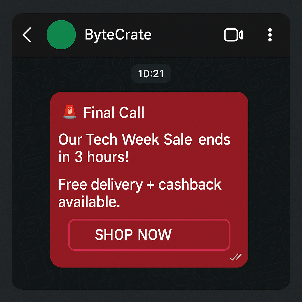 Tech shoppers are bombarded with online deals, especially during Tech Week, Black Friday, or New Year. ByteCrate needed a bold, direct line to the customer — and WhatsApp was the ideal tool.