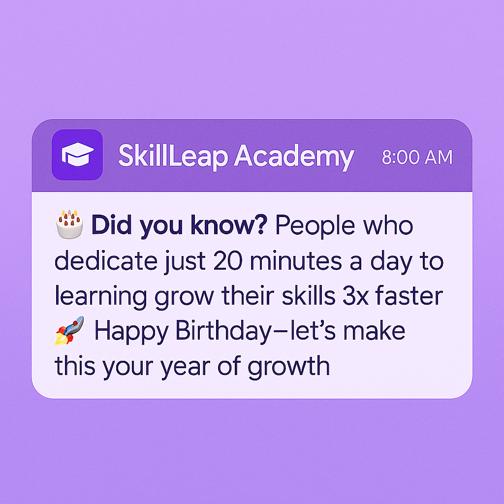 - 📩 Message 1: Educational hook: “🎂 Did you know? People who dedicate just 20 minutes a day to learning grow their skills 3x faster 🚀. Happy Birthday [Name]—let’s make this your year of growth!”