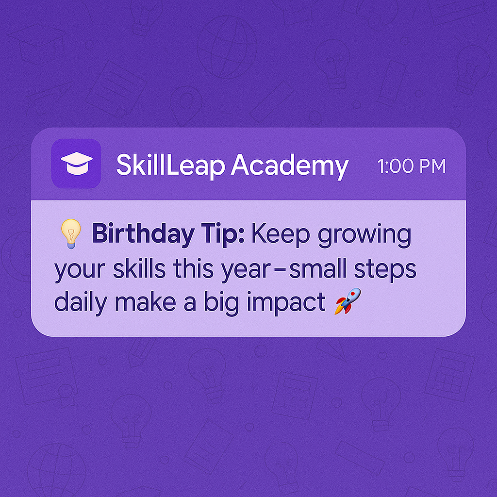 - 📩 Message 2: Added value tip: 💡 Birthday Tip: Keep growing your skills this year—small steps daily make a big impact 🚀