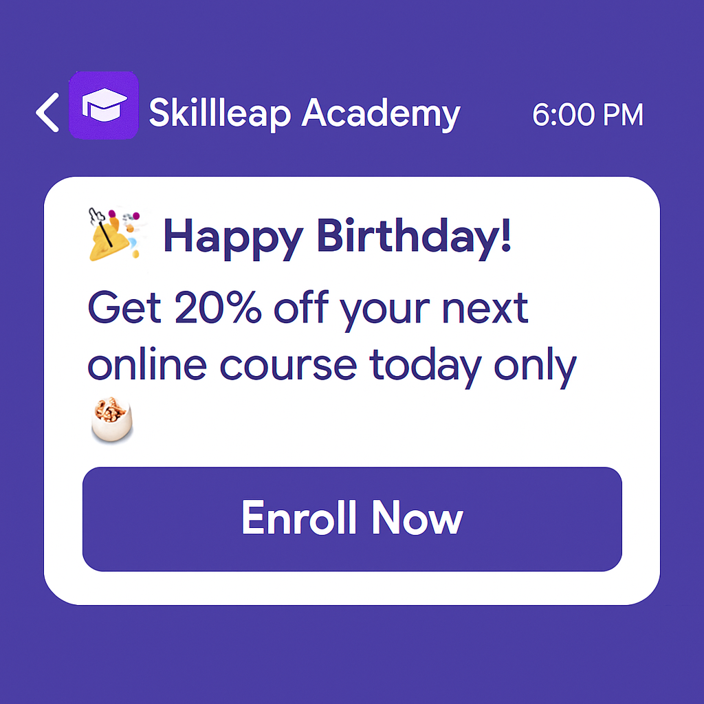 - 📩 Message 3: Exclusive offer: “🎉 Happy Birthday! Get 20% off your next online course today only 🎂.” CTA: Enroll Now