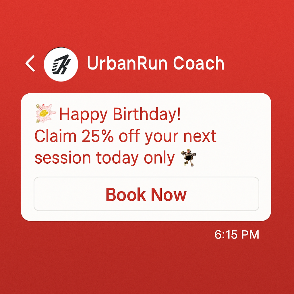 - ๐ฉ Message 3: ๐ Happy Birthday! Claim 25% off your next session today only ๐๏ธโโ๏ธ. CTA: Book Now