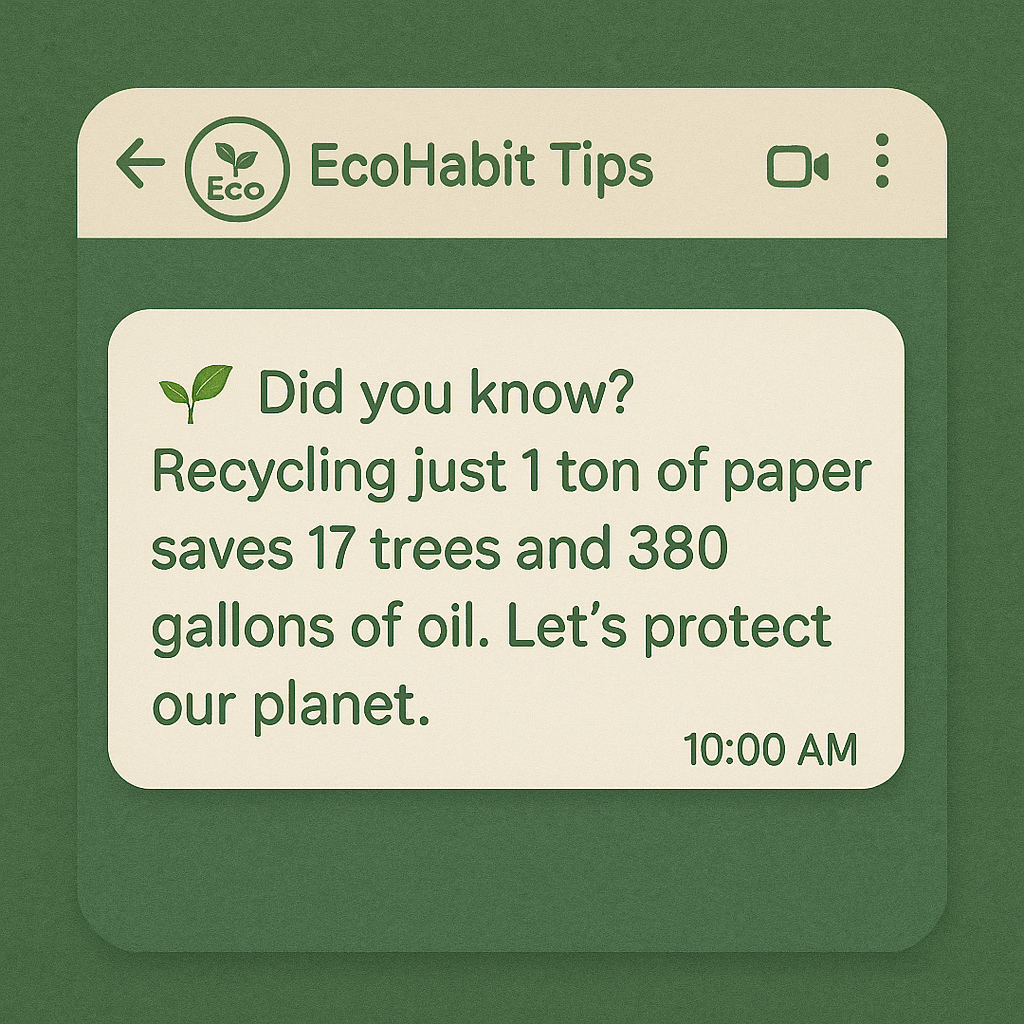 1. 📩 Message 1: 🌱 “Did you know? Recycling just 1 ton of paper saves 17 trees and 380 gallons of oil. Let’s protect our planet.”