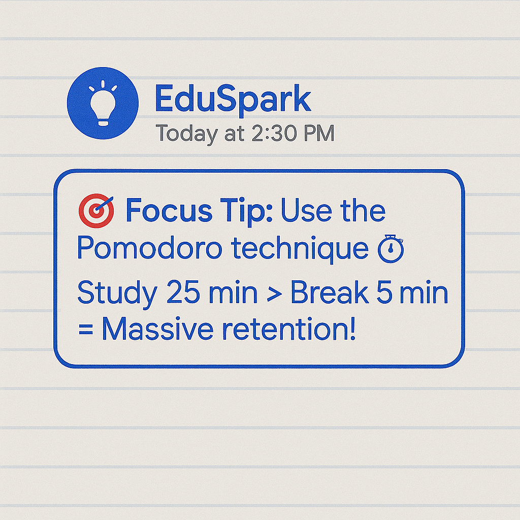 🎯 Focus Tip: Use the Pomodoro technique ⏲️