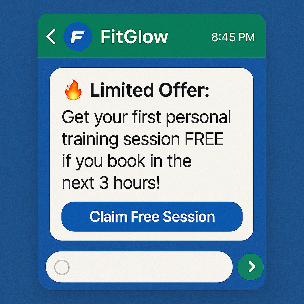 A practical tip that positions the brand as a supportive fitness partner. - 📩 Message 3: 🔥 Limited Offer: Get your first personal training session FREE if you book in the next 3 hours! ⏳