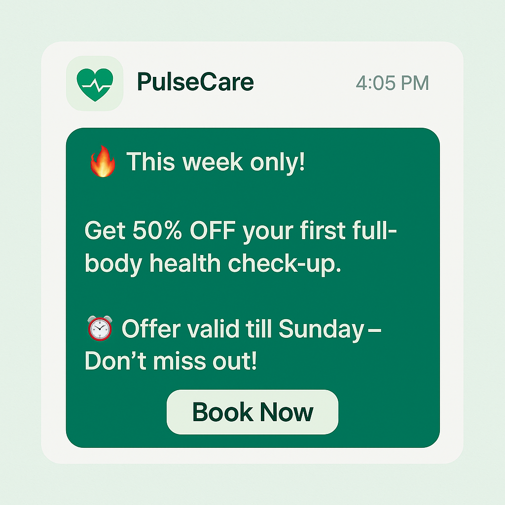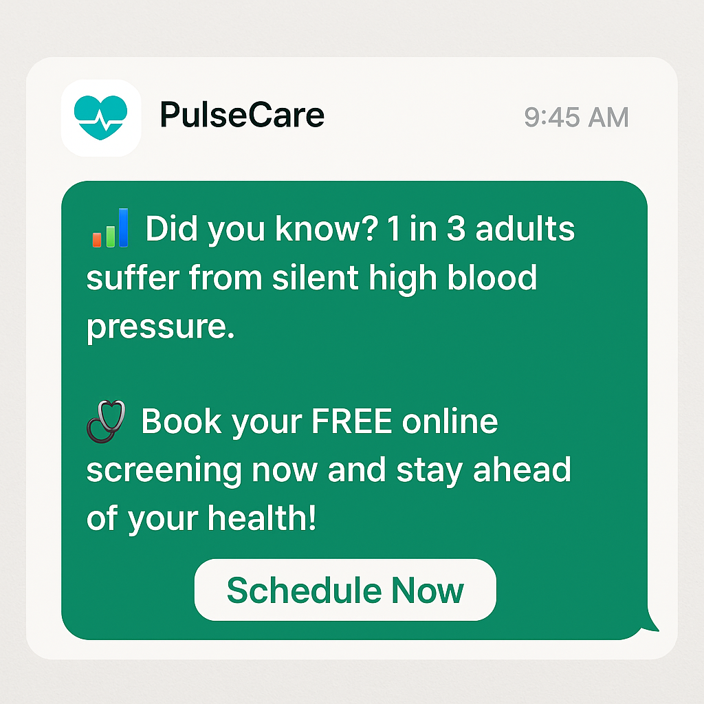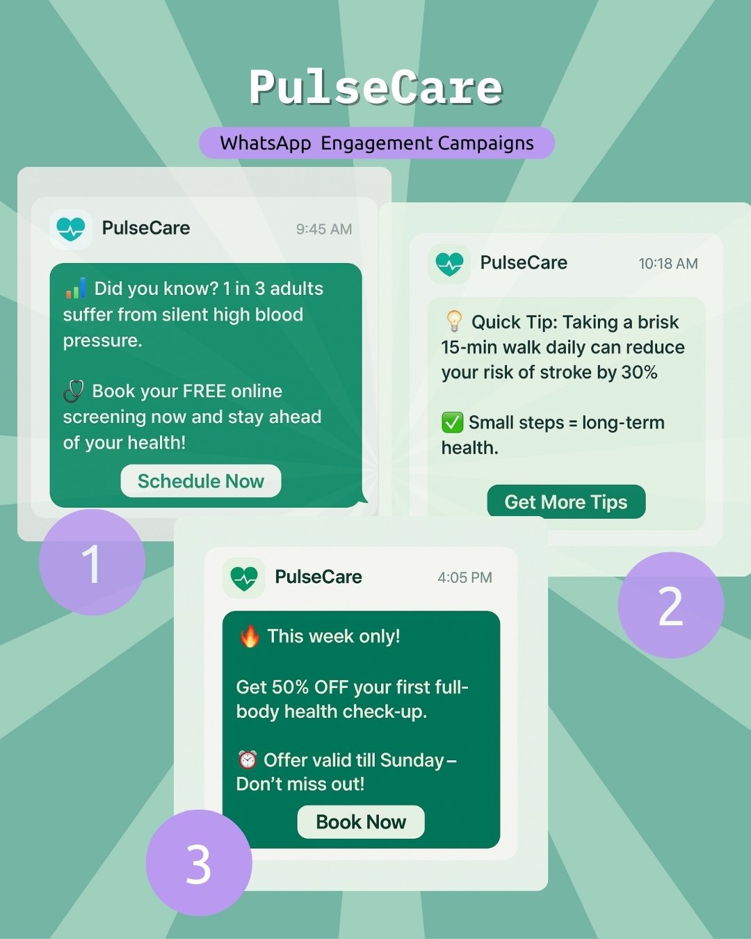 PulseCare aimed to increase awareness about silent high blood pressure and drive sign-ups for their health screening events. We designed a WhatsApp Event Engagement Campaign that combined educational content, practical health tips, and time-sensitive offers — ensuring high engagement and strong conversion rates.