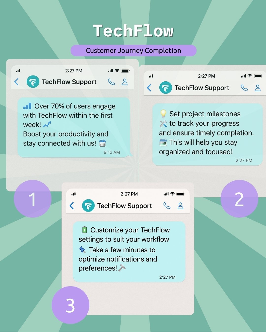 In the fast-paced tech productivity world, user interaction shouldn’t stop at onboarding. TechFlow applied our Customer Journey Completion – Upselling & Cross-Selling WhatsApp Microservice to connect with customers right after they started using the platform, offering tailored tips and feature upgrades to enhance their workflow efficiency.