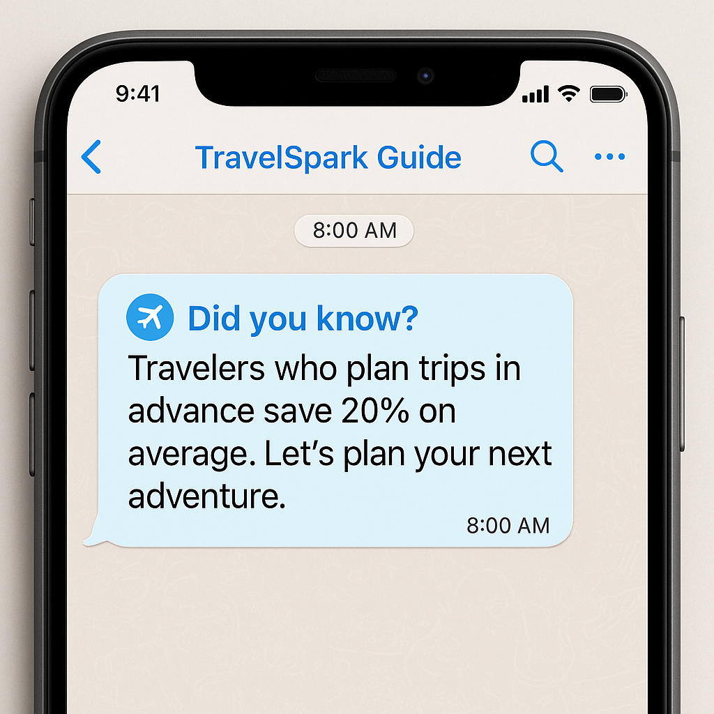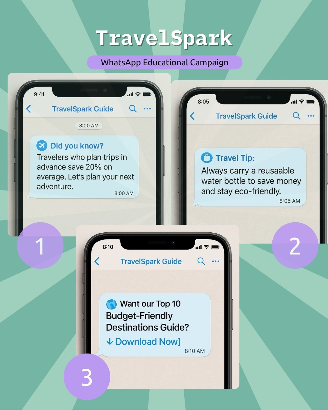 Through the WhatsApp Educational Campaigns – Auto-Learning Sequences, we designed a series of short, automated learning messages for TravelSpark. The goal: educate customers, build trust, and increase future sales opportunities.